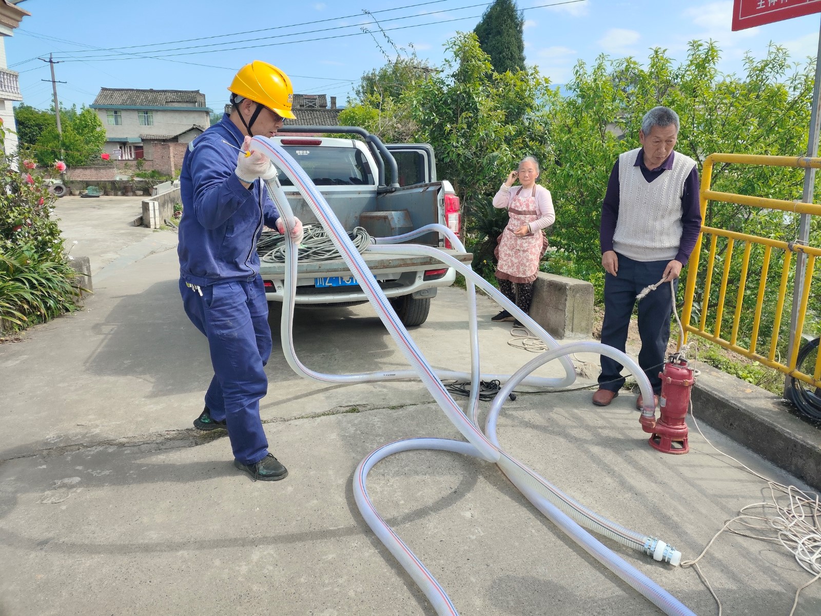 “大爺,抽水耕地時一定要注意安全,不要破壞電線的絕緣層,避免電線裸露漏電……”
