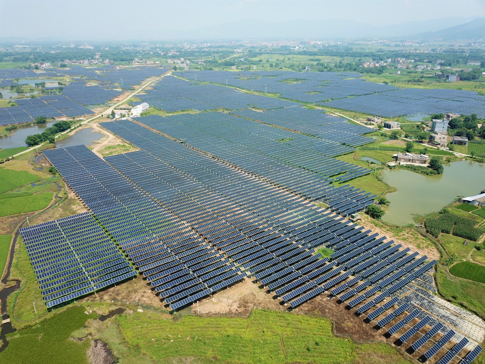 在廣西壯族自治區(qū)桂平市中部偏西,坡地上一大片高高架起的光伏藍板排列有序、十分顯眼,空中俯瞰猶如一汪藍色海洋,蔚為壯觀,與四周環(huán)繞的綠色田野構(gòu)成了一幅壯美和諧的生態(tài)畫卷。