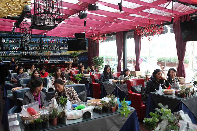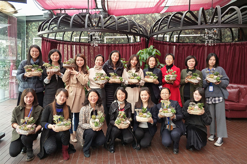 隨后,園藝老師向大家介紹了多肉植物的類別品種、形態(tài)特征、栽培方法以及微景觀的藝術(shù)設(shè)計與賞鑒。在體驗環(huán)節(jié),面對一棵棵萌態(tài)可掬的“小鮮肉”,栩栩如生的小擺飾,精美別致的花盆,大家興奮不已,躍躍欲試。工作中干練的女漢子變成了心靈手巧的園藝師,她們小心翼翼地將嬌柔的植物安入花內(nèi),鋪上彩色石子,放上小飾品,每個人都發(fā)揮著豐富的想象和新奇的創(chuàng)意,一座座“迷你小花園”各具特色,極富設(shè)計感。大家紛紛拿出手機拍下作品,記錄下活動的美好瞬間。喜歡養(yǎng)花的姐妹們還向老師請教花卉種植和養(yǎng)護知識,每個人的臉上都洋溢著輕松和愉悅。