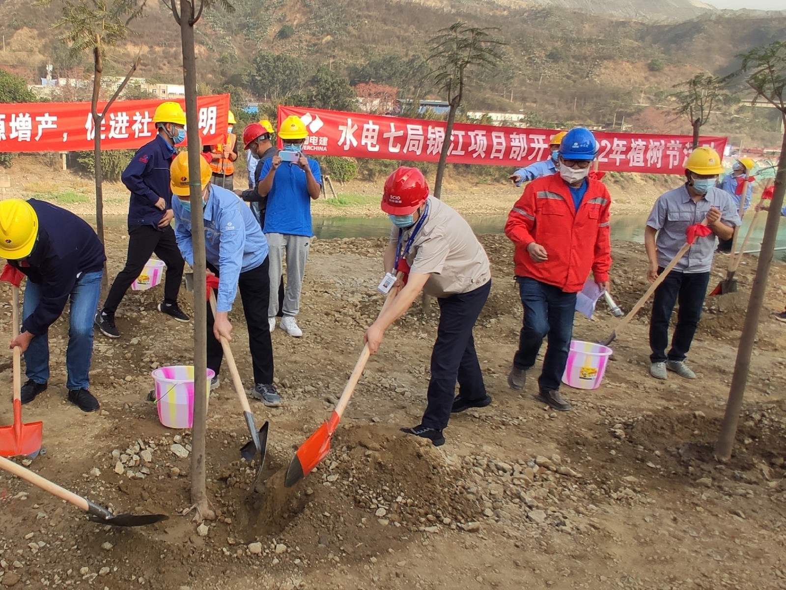 陽春三月,萬物復蘇。3月12日,適逢一年一度植樹節,銀江水電站各參建單位在金沙江邊、工程施工現場空曠區域聯合開展了“3.12”植樹節活動。活動由攀水電公司牽頭,華東院環水保監理組織,水電五局、水電七局聯合承辦,各參建單位共同參與。攀水電公司黨總支委員、總經理吳巍嶼,黨總支委員、董事會秘書、工會主席鄧勇與各參建單位項目主要負責人、員工代表共同種下了一顆顆象征團結友誼和綠色環保的同心樹。