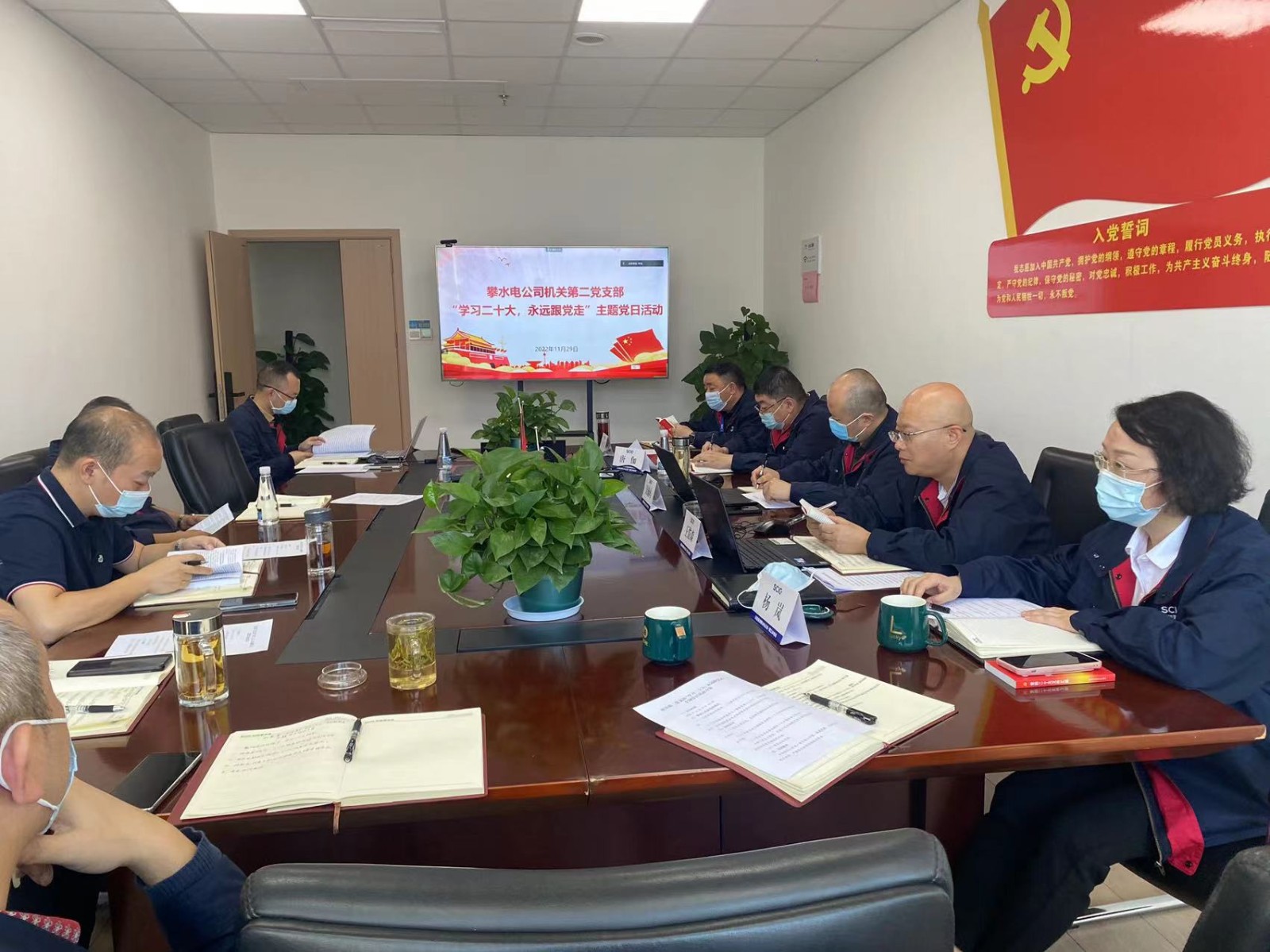 旗幟指引方向,信心凝聚力量。11月29日,攀水電公司機關第二黨支部采取線上與線下相結合的方式組織開展“學習二十大,永遠跟黨走”主題黨日活動,所屬黨員、非黨中干及入黨積極分子20人參加活動,黨總支副書記、總經理吳巍嶼等5名領導班子成員、黨總支委員落實“雙重組織生活”要求,以普通黨員身份參加活動。