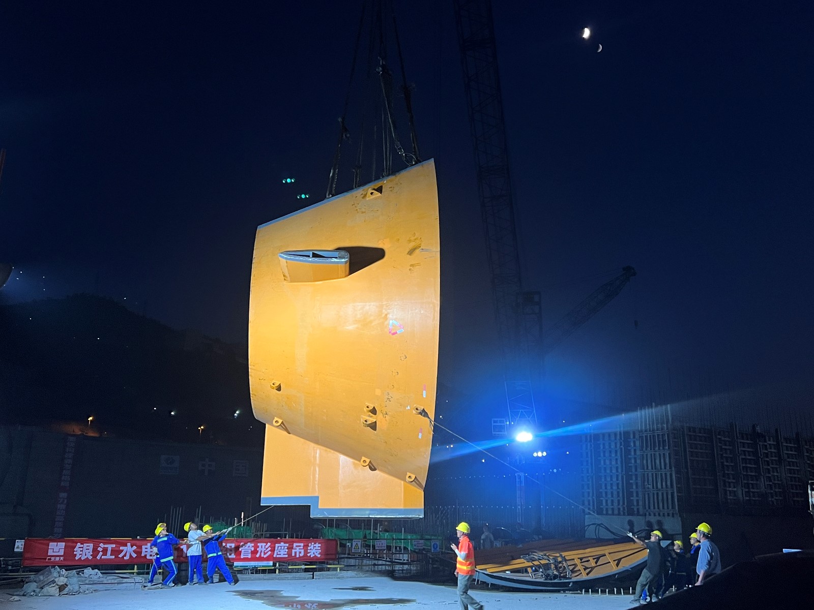 10月20日履帶吊車試吊驗(yàn)收及下固定導(dǎo)葉順利吊裝完成后,從20日16點(diǎn)開始至21日20:00結(jié)束,歷經(jīng)運(yùn)輸、翻身及吊裝三個(gè)階段長達(dá)18個(gè)小時(shí)工作,管形座最重件第一瓣內(nèi)殼在公司領(lǐng)導(dǎo)的現(xiàn)場指導(dǎo)下穩(wěn)穩(wěn)落至安裝位置,后續(xù)公司將組織參建單位一鼓作氣將首臺(tái)機(jī)組管形座剩余內(nèi)殼、外殼、前錐體及固定導(dǎo)葉等悉數(shù)吊裝到位,力爭年底完成安裝工作,為實(shí)現(xiàn)2025年一季度首臺(tái)機(jī)組投產(chǎn)發(fā)電目標(biāo)打下堅(jiān)實(shí)基礎(chǔ)。