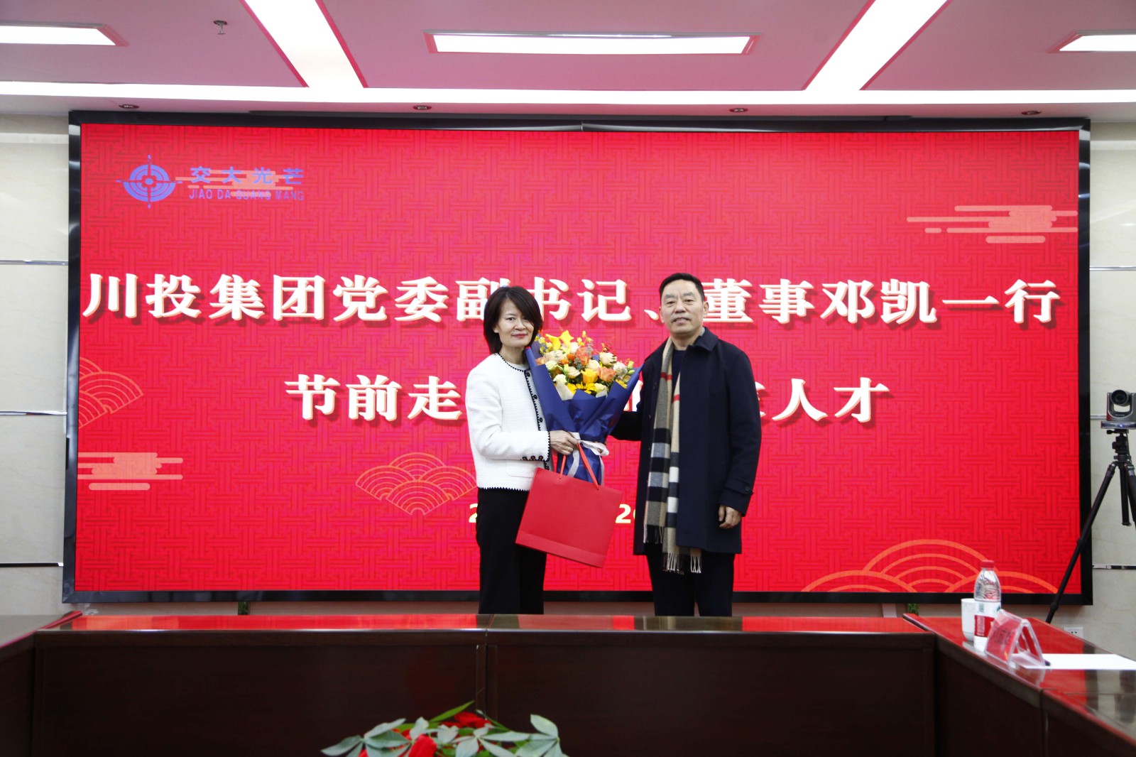 1月26日,川投集團黨委副書記、董事鄧凱帶隊赴交大光芒走訪慰問專家人才。川投集團機關黨委書記、黨委組織部部長朱莉,黨委宣傳部(群團工作部)部長何金輝參加走訪慰問。川投能源黨委委員、財務總監兼交大光芒董事長劉好一同參加走訪慰問。