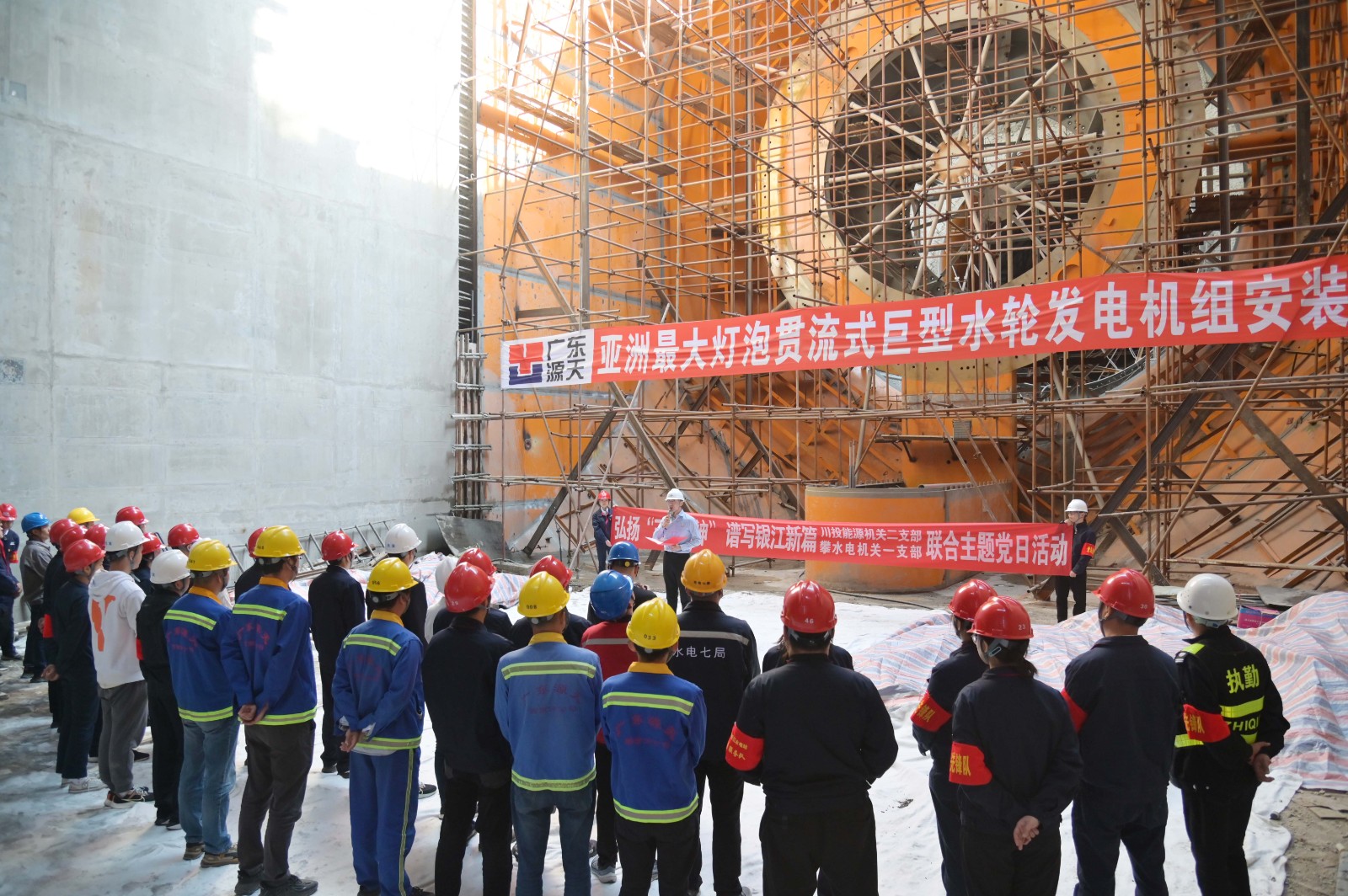 在銀江水電站亞洲最大燈泡貫流式巨型水輪發電機組安裝現場,川投能源機關二支部書記李睿講授了工地微黨課《承諾》,與大家一起重溫銀江水電站建設過程中的感人故事。活動中,徐孝剛用通俗易懂的語言,為現場同志介紹了銀江水電站的建設特點、施工情況和下一步工程建設計劃,并號召全體黨員和團員青年要圍繞“保一爭二”提前發電重要目標,團結一心、勇挑重擔、善作善成。