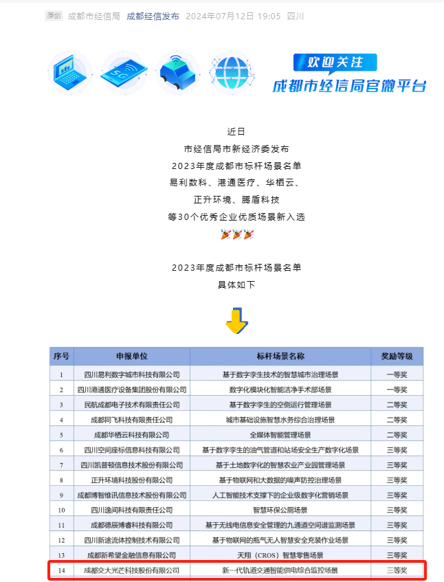 近日,成都市經信局市新經濟委發布2023年度成都市標桿場景名單,交大光芒新一代軌道交通智能供電綜合監控場景榮獲三等獎。