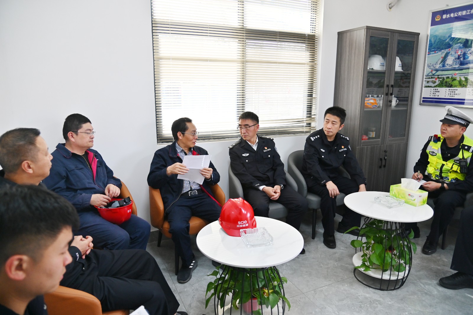 在工地現(xiàn)場(chǎng),徐孝剛詳細(xì)介紹了銀江水電站目前生產(chǎn)運(yùn)行、施工進(jìn)度、防洪度汛和應(yīng)急預(yù)案制定等工作情況,對(duì)市公安局及相關(guān)部門長(zhǎng)期以來對(duì)攀水電公司及銀江水電站的幫助與支持表示衷心的感謝。他表示,自銀江水電站警長(zhǎng)辦公室成立以來,先后協(xié)調(diào)解決了巨型機(jī)組大件運(yùn)輸、銀江大橋交通信號(hào)燈移交、確保截流所需五萬余噸石料順利運(yùn)輸、施工區(qū)域市民漂流等諸多難題,基層干警加班加點(diǎn)維護(hù)周邊治安秩序,全力為銀江水電站項(xiàng)目建設(shè)保駕護(hù)航。今年,銀江水電站要實(shí)現(xiàn)全面投產(chǎn)發(fā)電目標(biāo),希望在警長(zhǎng)辦公室在銀江水電站后續(xù)3臺(tái)機(jī)組大件運(yùn)輸和庫區(qū)安全等事項(xiàng)上繼續(xù)給予幫助支持。