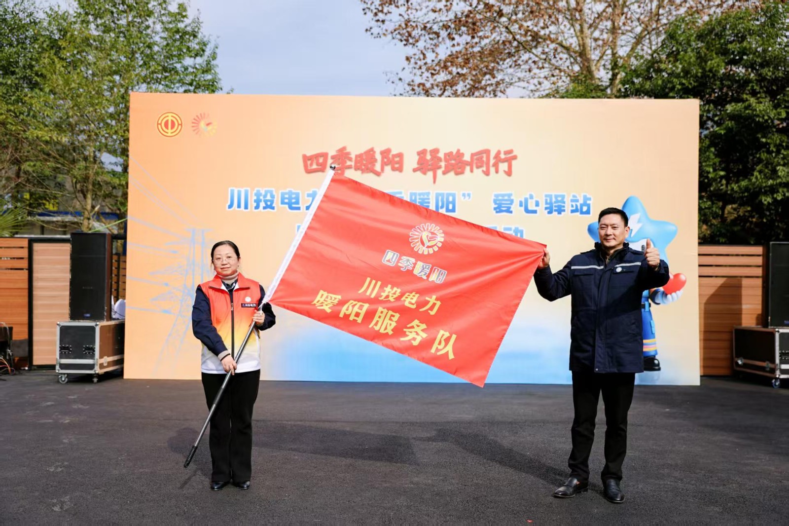 啟用活動在激昂的大鼓舞中拉開序幕,鏗鏘鼓聲既奏響新年奮進之音,也傳遞出國企服務民生的溫暖擔當。活動現場,冉蘭平為川投電力“四季暖陽”愛心驛站(天彭電力鳳鳴湖站)授牌,并與楊濤分別為川投電力“暖陽”服務總隊和所屬公司、電廠“暖陽”服務分隊授旗。天彭電力沙金車間愛心驛站服務隊員代表現場表態,將以驛站為陣地,立足能源保供主責主業,當好服務群眾的“貼心人”,讓“四季暖陽”的溫度持續傳遞、惠及更廣。